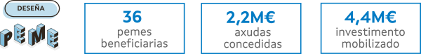 DeseñaPeme fará posible o desenvolvemento de 36 novos proxectos para que as empresas beneficiarias melloren a súa competitividade grazas ao deseño de produto, o deseño de servizos e experiencias e o deseño de marca e identidade corporativa. A axuda media ascende a máis de 61.000€.