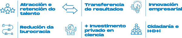 Entre as novidades da futura lei, atópanse a regulación de ámbitos como a atracción e retención de talento, a transferencia efectiva de resultados para achegar a ciencia á industria, a innovación empresarial ou a redución da burocracia. Ademais, a Xunta busca estimular a iniciativa privada e o investimento en ciencia para que os resultados acadados nas investigacións teñan un impacto maior, así como conectar a cidadanía coa I+D+i. Será tamén relevante a descentralización e o reforzo da innovación territorial a través dos plans locais de I+D+i para levar a ciencia e a innovación a todo o territorio galego.